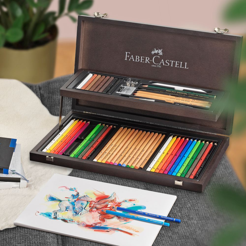 Kolekcia umeleckých potrieb Art&Graphic v drevenej kazete. Pre umelcov kolekcia predstavuje prestížne kresliace potreby pre tvorbu a pre znalcov sú dekoratívnym dizajnovým predmetom. Elegantná drevená kazeta vo farbe wenge. Sofistikované umelecké potreby: pastelky a pastely Polychromos, akvarelové ceruzky Albrecht Dürer a pastely Pitt, ceruzky monochrome uložené k drevenom kufríku.