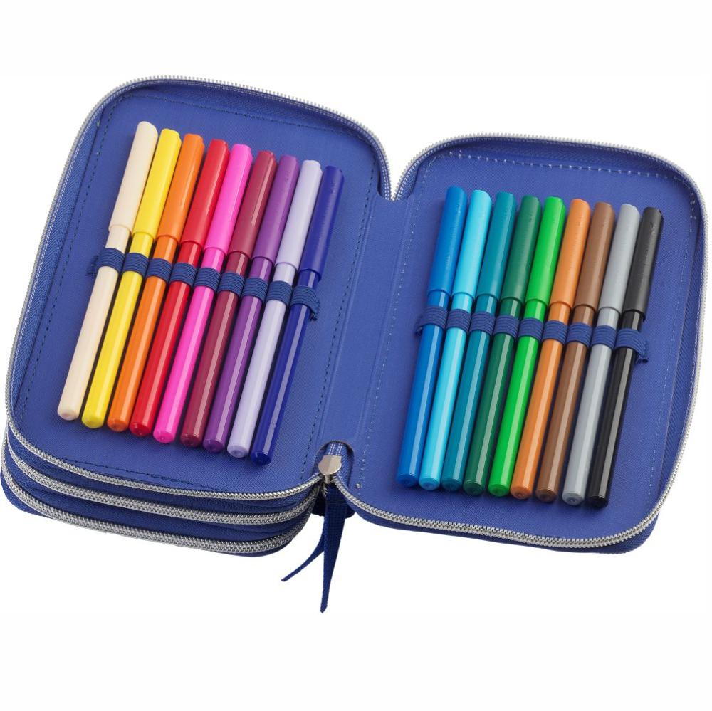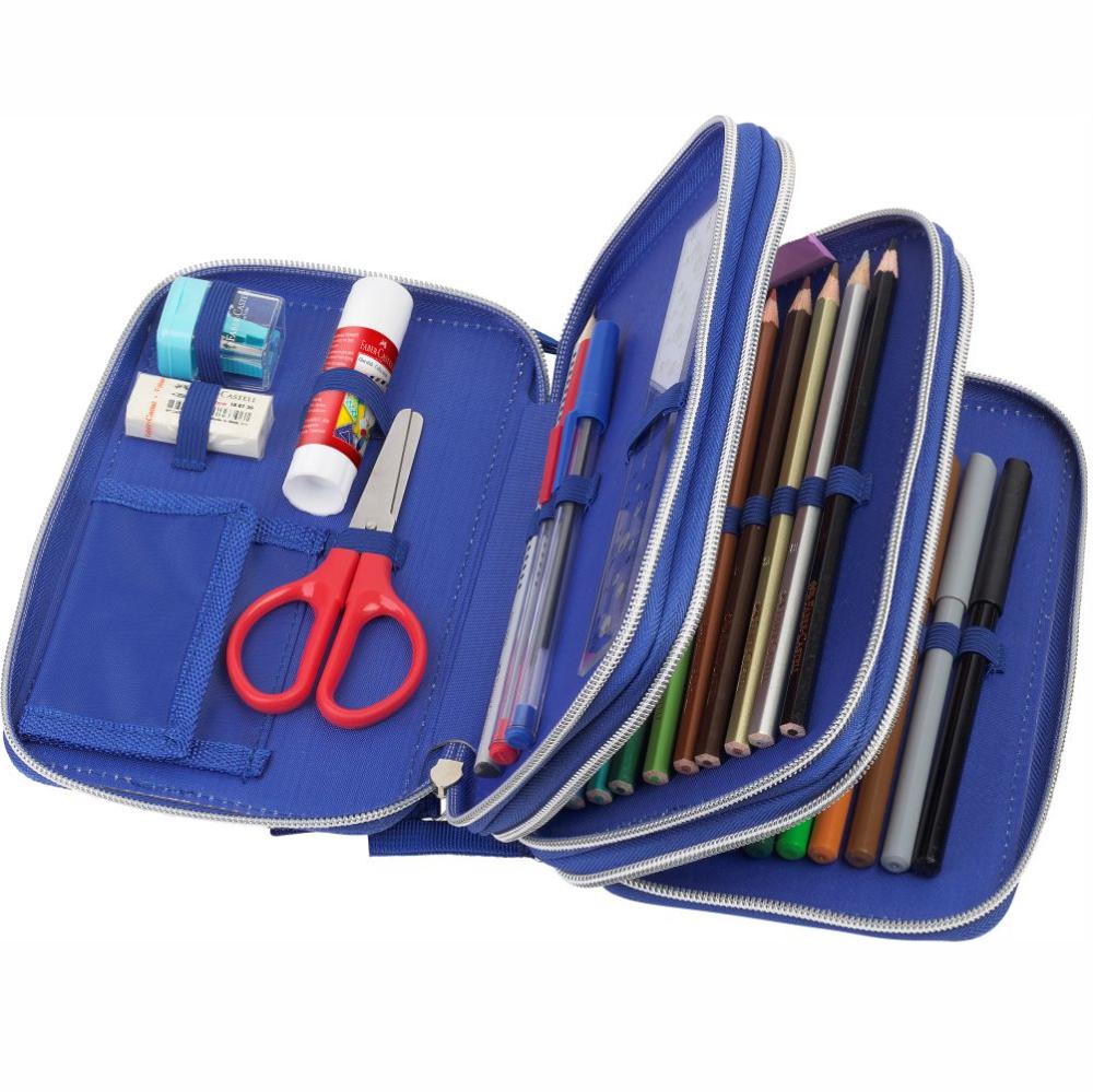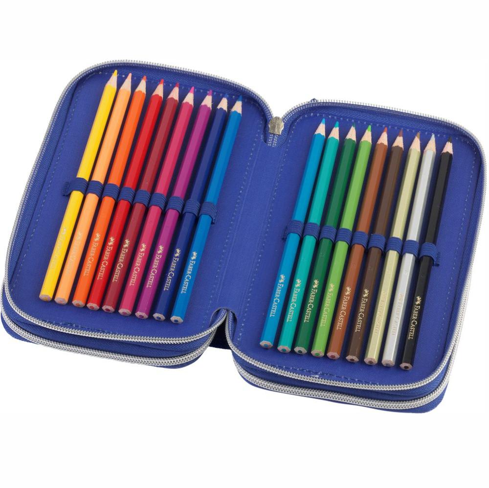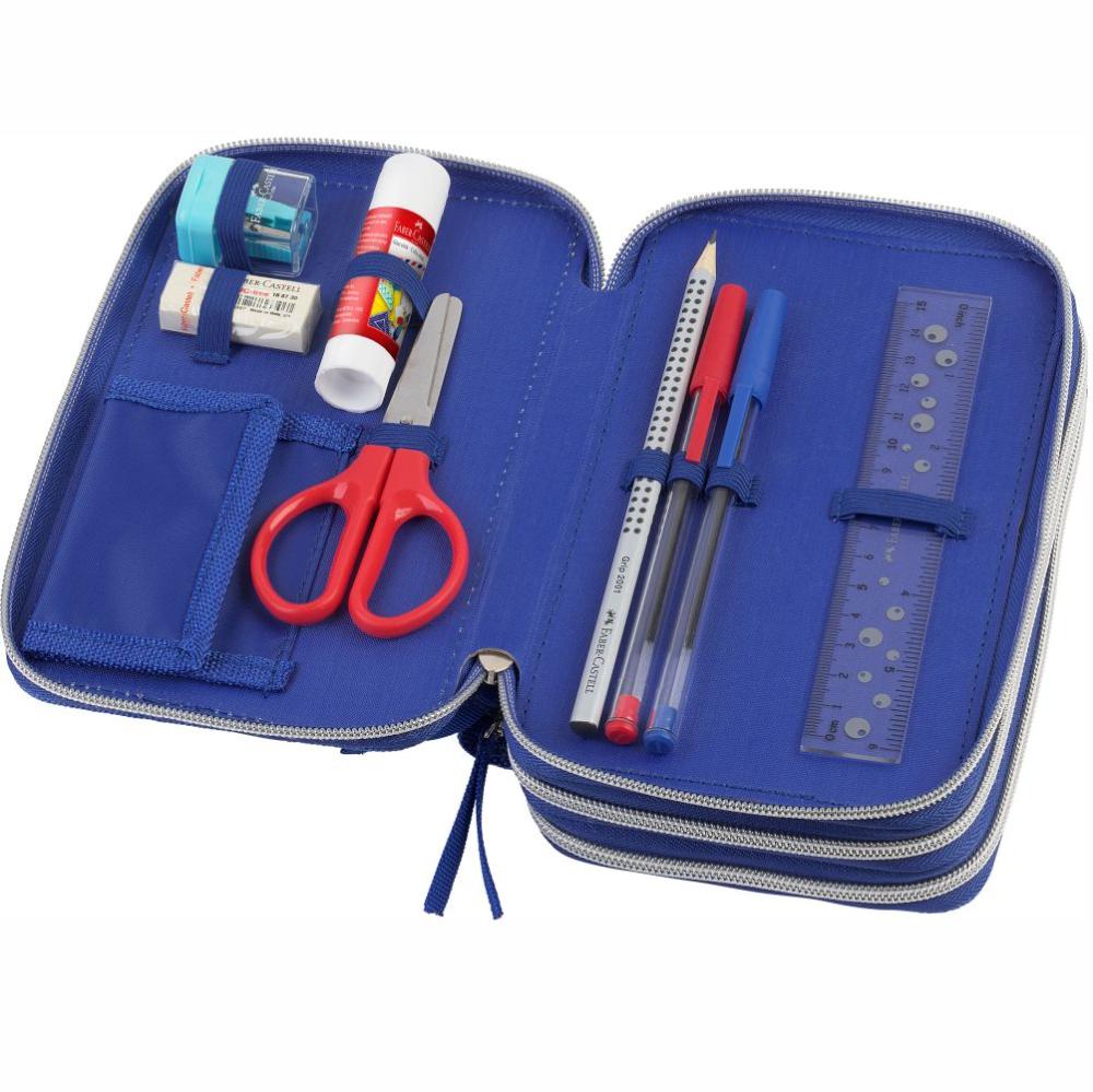 Školský peračník s trendy dizajnom Dino pre I. stupeň ZŠ, trojkomorový. Obsahuje všetky nevyhnutné písacie potreby značky Faber-Castell. Peračník má 3 priehradky uzatvárané na zips a vrecko na peniaze. Náplň: 18 ks farebných ceruziek, 18 ks fixiek, 1 ks grafitová ceruzka Grip, 2 ks guľôčkové pero (červené a modré), 1 ks nožnice, 1 ks lepiaca tyčinka 9 gr., 1 ks strúhadlo so zásobníkom, 1 ks guma bez PVC, 1 ks pravítko 15 cm