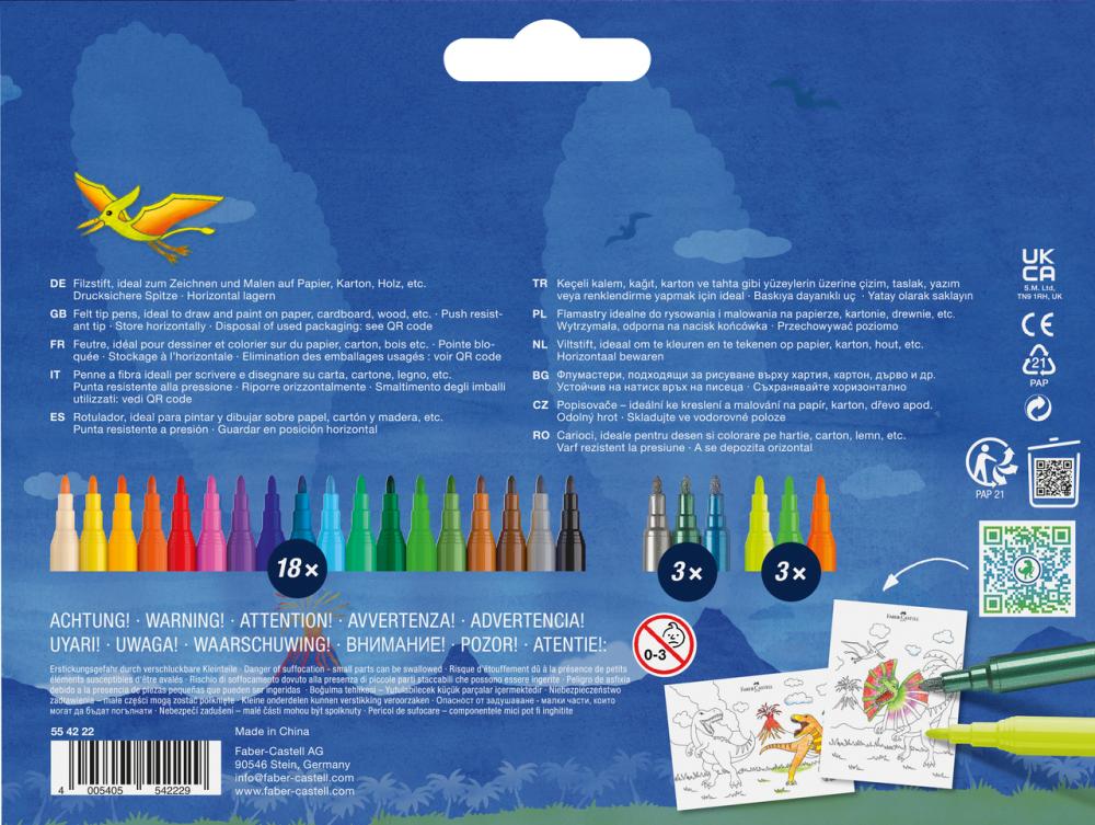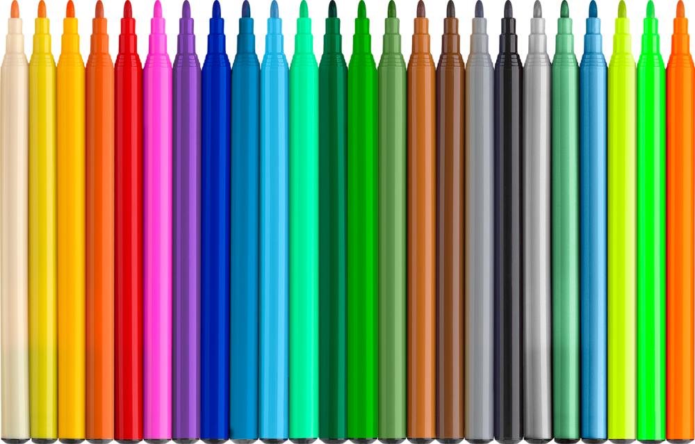 Sada guľatých fixiek pre každú príležitosť. Vhodné na maľovanie väčších plôch aj pre kreslenie jemných línií a detailov. Pevný hrot. Vyprateľné z väčšiny textílií. Obsahuje 18 klasických farieb + 6 metalických farieb.