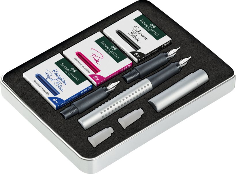 Kaligrafická sada Grip 2011 strieborná. Nová výzva pre vyznávačov ručného písania a maľovania. Plniace perá Grip s kaligrafickým hrotom vás presvedčia svojim príťažlivým dizajnom a prepracovanou ergonómiou. Perá v klasickej striebornej farbe s charakteristickými bodkami.