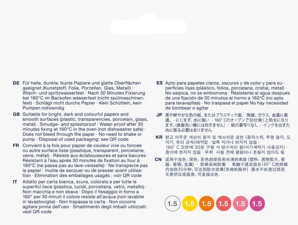 · Po fixácii v rúre pri teplote 160 °C môže byť atrament vodeodolný (nie je vhodný do myčky). Farba nepresvitá cez papier. Hrúbka hrotu 1,5 mm. 6 farieb v balení.