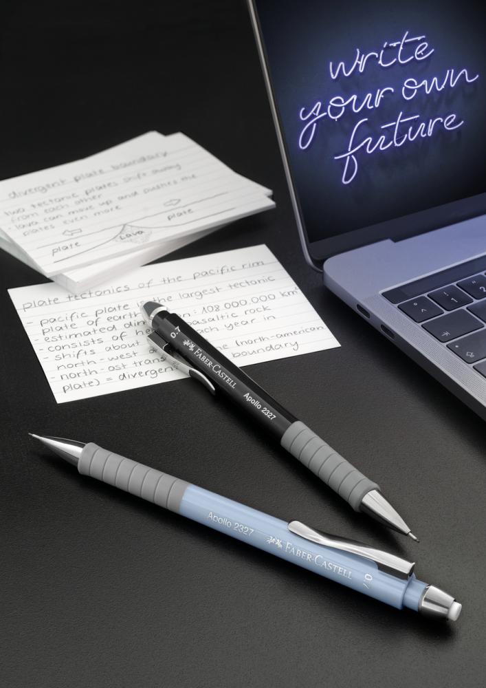 Moderná mechanická ceruzka Apollo pre komfortné písanie. Tuha 0,7 mm s mimoriadnou odolnosťou voči lámaniu. Apollo je k dispozícii v atraktívnych farbách, každá ceruzka je vybavená vysúvacou gumou pod koncovým krytom.