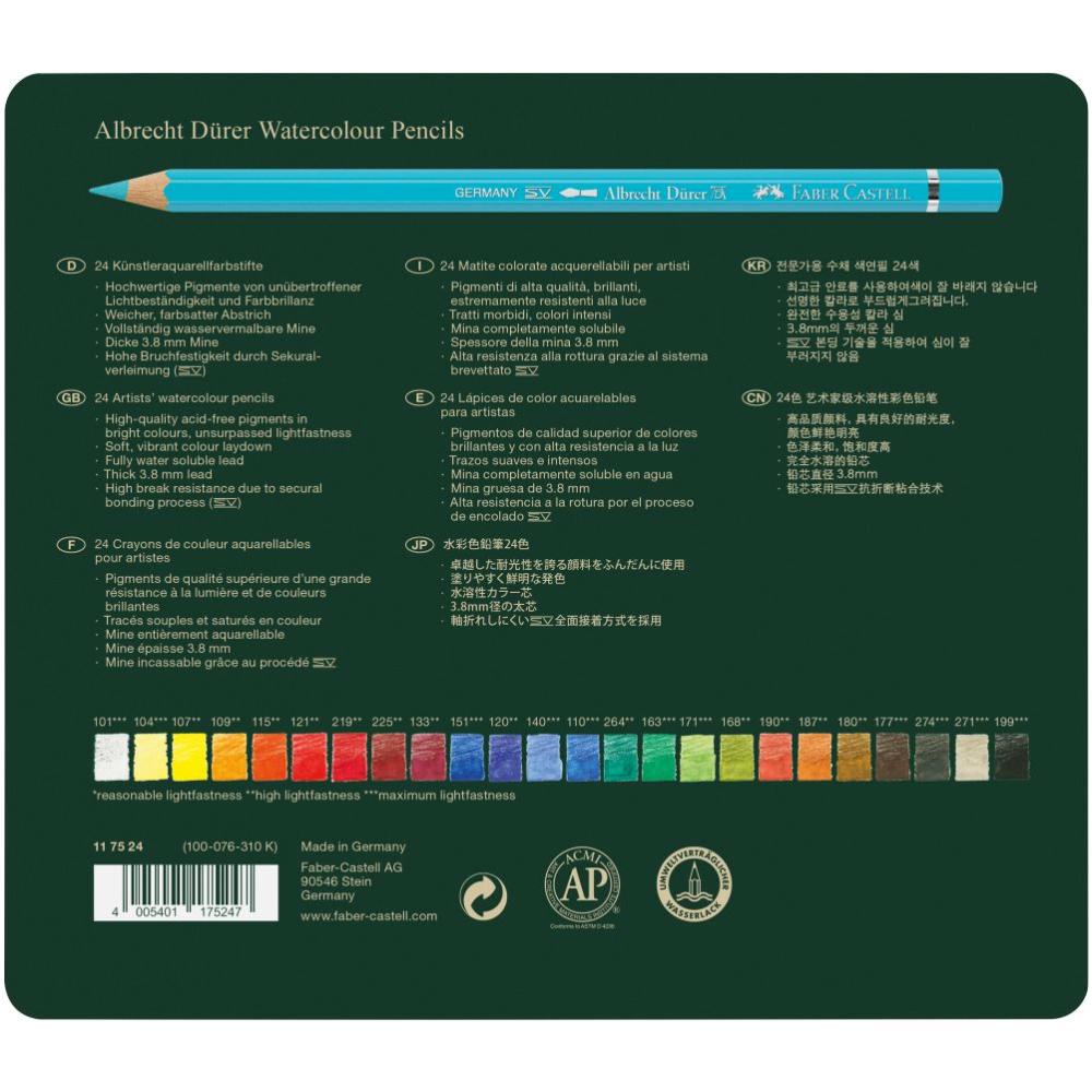 Albrecht Dürer akvarelové pastelky poskytujú umelcom možnosť všestranného prejavu pri kreslení, tieňovaní a maľovaní akvarelov. Vysoko kvalitné materiály v kombinácii s viac ako 250 ročnou skúsenosťou spoločnosti Faber-Castell prispievajú k tomu, že akvarelové ceruzky pri práci s vodou vytvárajú neprekonateľné žiarivé efekty. Pár ťahov štetca dokáže nanesené farby zjemniť, rozotrieť na väčšiu plochu a tým sa odhalí ich plná a jedinečná sila. V závislosti od použitého papiera je možné farby úplne rozotrieť, pigmenty sa rozpustia a správajú sa ako klasické akvarely. Farba permanentne zasychá a to umožňuje nanášať ďalšiu vrstvu farby bez toho, aby sa pôvodná farba rozmazala. To je aj dôvod prečo tieto pastelky akvarelisti oceňujú a radi ich používajú pri detailných kresbách svojich akvarelov.
