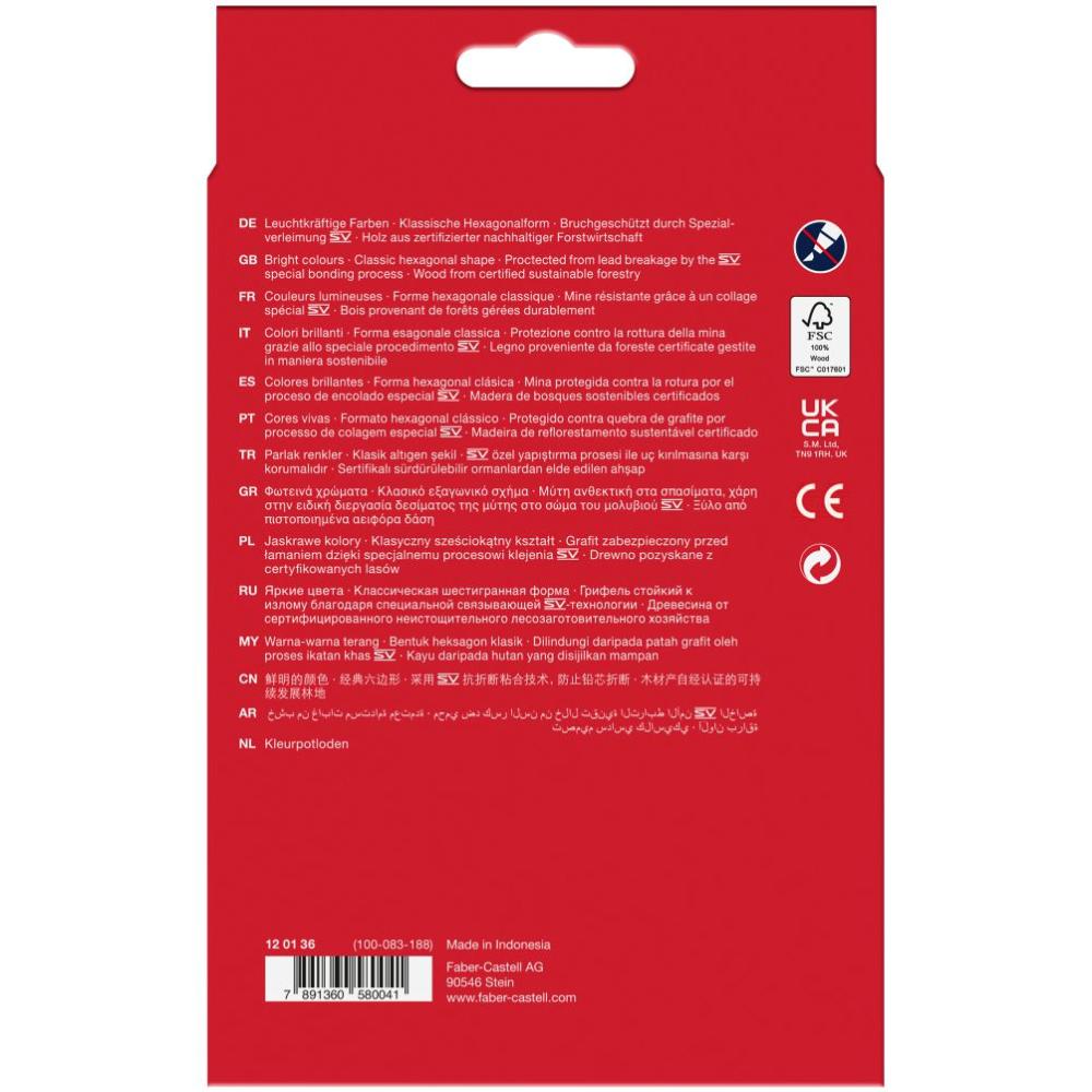 Klasické šesťhranné drevené pastelky v štandardnej veľkosti. Vyznačujú sa živými farbami a vďaka špeciálnemu lepeniu sú odolné voči nárazom. Pastelky sú vyrobené zo 100% FSC certifikovaného dreva.