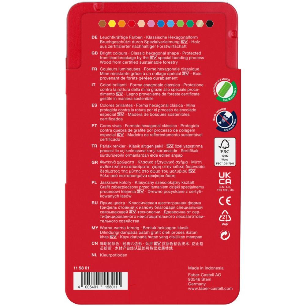 · Kvalitné drevo zaručuje ľahké strúhanie · Obsahuje zlatú pastelku · Drevo z certifikovaného trvalo udržateľného lesného hospodárstva · 12 farieb v kovovej krabičke