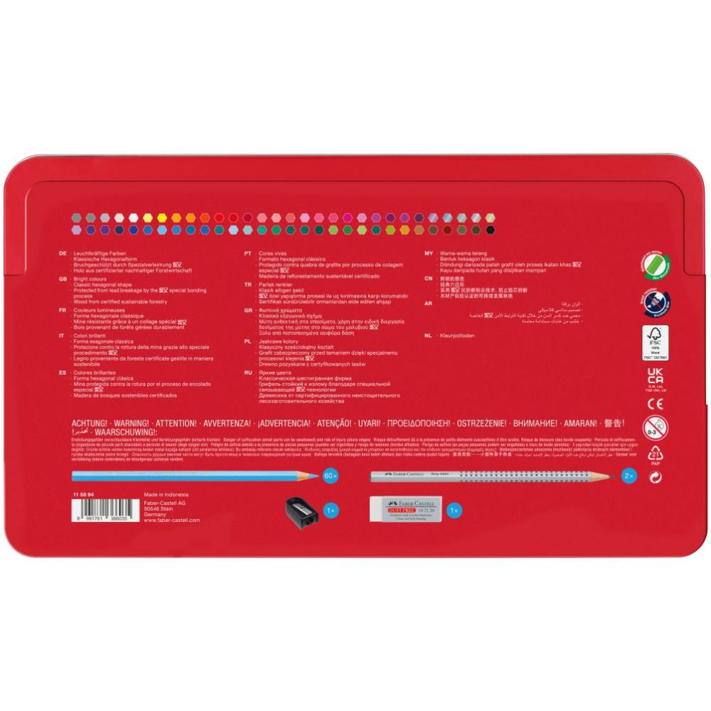 · Drevo z certifikovaného trvalo udržateľného lesného hospodárstva · 60 farieb v kovovej krabičke · Balenie obsahuje strúhadlo, gumu a 2 grafitové ceruzky