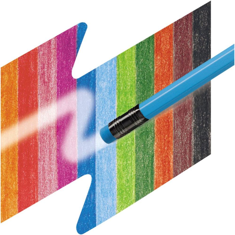 Drevené šesťhranné pastelky s integrovanou gumou. Možnosť gumovania farieb rovnako, ako pri grafitových ceruzkách. Vyprateľné z textílií. Špeciálne lepenie SV zamedzuje lámaniu tuhy. Ekologický povrchový lak na vodnej báze.