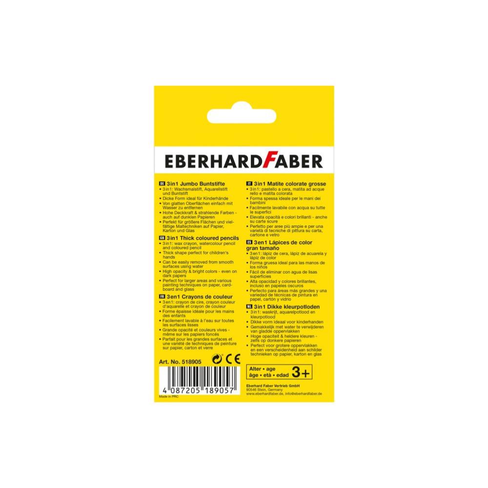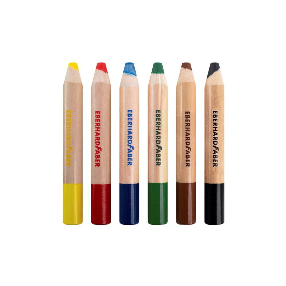 Keď maľovanie a kreslenie je obzvlášť zábavné! Pastelka Jumbo 3 v 1, voskovka, akvarelová pastelka, farebná pastelka. Hrubý tvar je ideálny pre malé detské ruky a ich prvé pokusy maľovania. Farba je hladká a má vysokú kryciu schopnosť aj na tmavom papieri. Tuha má hrúbku až 10 mm. Je odolná voči lámaniu. Pastelky sú vhodné pre maľovanie väčších plôch a pre rôzne techniky maľovania aj na kartón a sklo. Z hladkých povrchov sa dá odstrániť vodou. 6 farebné