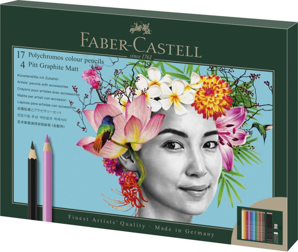 Darčekový set medzinárodne oceňovaných pasteliek Polychromos a grafitových ceruziek Pitt Matt, ktoré sa považujú za svetový unikát. Pastelky Polychromos zaručujú obrazom maximálnu svetlostálosť, vyznačujú sa brilantnými farbami, optimálnym nanášaním farieb a širokou farebnou škálou. Pastelky dopĺňajú inovatívne ceruzky z dielne Faber-Castell špeciálne vyvinuté na zníženie odrazov svetla na papieri. Ceruzky Pitt Matt sa vyznačujú ultra matným grafitovým povrchom na papieri a vysokou hustotou tonálnych hodnôt pre maximálny efekt hĺbky. Set obsahuje 17 pasteliek Polychromos s tuhou 3,8 mm, s kvalitným pigmentom odolným voči rozmazaniu. 4 grafitové ceruzky Pitt Matt s tvrdosťou: HB; 4B; 8B; 14B, gumu a strúhadlo.