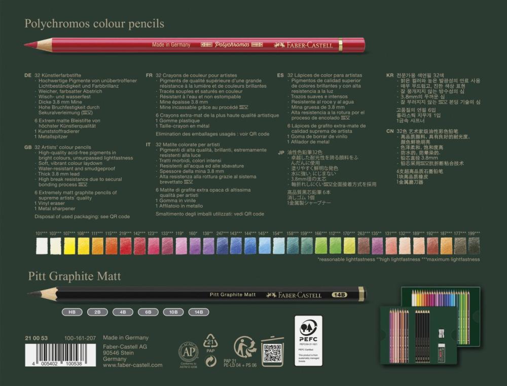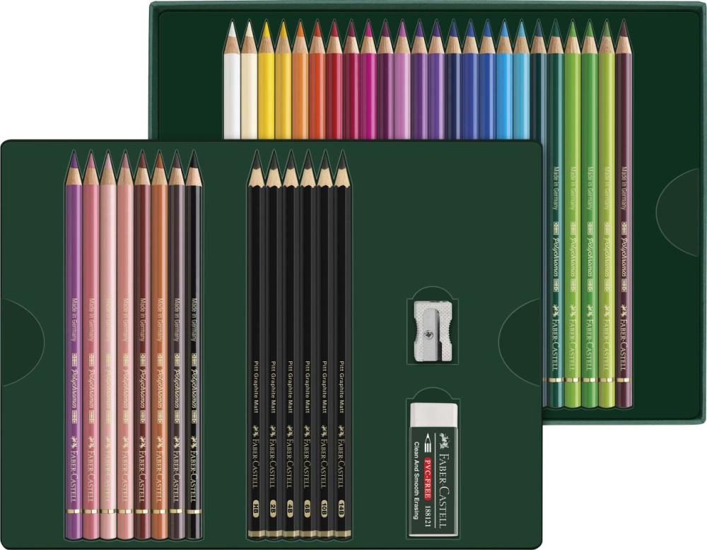 Darčekový set medzinárodne oceňovaných pasteliek Polychromos a grafitových ceruziek Pitt Matt, ktoré sa považujú za svetový unikát. Pastelky Polychromos zaručujú obrazom maximálnu svetlostálosť, vyznačujú sa brilantnými farbami, optimálnym nanášaním farieb a širokou farebnou škálou. Pastelky dopĺňajú inovatívne ceruzky z dielne Faber-Castell špeciálne vyvinuté na zníženie odrazov svetla na papieri. Ceruzky Pitt Matt sa vyznačujú ultra matným grafitovým povrchom na papieri a vysokou hustotou tonálnych hodnôt pre maximálny efekt hĺbky. Set obsahuje 32 pasteliek Polychromos s tuhou 3,8 mm, s kvalitným pigmentom odolným voči rozmazaniu. 6 grafitových ceruziek Pitt Matt s tvrdosťou: HB; 2B; 4B; 6B; 10B; 14B, gumu a strúhadlo.