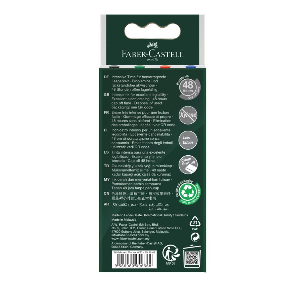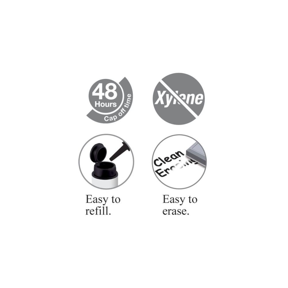 Spoločnosť Faber-Castell poskytuje popisovač na tabuľu, špeciálne navrhnutý pre vaše potreby: Popisovač sa dodáva s guľatým hrotom, atramentom s vysokou intenzitou, vďaka ktorému je čítanie veľmi jednoduché. Zaschnutý atrament sa ľahko čistí, vďaka čomu sú opravy jednoduché a čistenie rýchle. Aby sa predišlo plytvaniu, je popisovač na tabuľu znovu naplniteľný: stačí odklopiť uzáver a doplniť popisovač – je to také jednoduché.