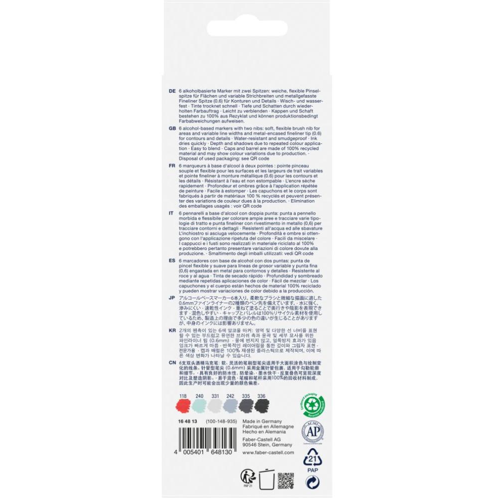 Popisovač s dvoma rôznymi hrotmi - so štetcovým s flexibilnou hrúbkou čiary 1-5 mm a jemným perom v kovovom puzdre s hrúbkou 0,6 mm. Skicovací marker s jasnými farbami je ideálny na vytváranie skíc, náčrtov... Či už ste profesionálny dizajnér alebo hobby umelec, layoutový marker od Faber-Castell je nepostrádateľným nástrojom pre každého, kto chce svoje nápady uviesť do života. Marker je priekopníkom vo svojej oblasti: používaním 100% recyklovaného plastu na uzáver a telo chráni životné prostredie.