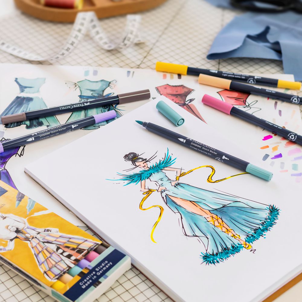 Popisovač s dvoma rôznymi hrotmi - so štetcovým s flexibilnou hrúbkou čiary 1-5 mm a jemným perom v kovovom puzdre s hrúbkou 0,6 mm. Skicovací marker s jasnými farbami je ideálny na vytváranie skíc, náčrtov... Či už ste profesionálny dizajnér alebo hobby umelec, layoutový marker od Faber-Castell je nepostrádateľným nástrojom pre každého, kto chce svoje nápady uviesť do života. Marker je priekopníkom vo svojej oblasti: používaním 100% recyklovaného plastu na uzáver a telo chráni životné prostredie.