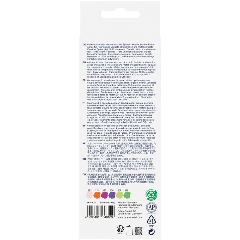 Podrobné špecifikácie a vlastnosti: Popisovač Gofa Sketch Dual set 6 Novel disponuje dvomi špecifickými hrotmi, ktoré pokrývajú široké spektrum umeleckých potrieb. Mäkký štetcový hrot umožňuje flexibilné vykreslenie čiar rôznej hrúbky, od jemných detailov po výrazné ťahy, čo je ideálne pre akvarelové efekty, tieňovanie či expresívne skice. Jemný kovový hrot s priemerom 0,6 mm poskytuje presnosť potrebnú pre kontúry, detaily a technické kresby. Atrament je na báze alkoholu, vďaka čomu je rýchloschnúci, trvácny a odolný proti rozmazaniu. Opakované nanášanie farby zvyšuje kryciu schopnosť, čo ocenia profesionáli i hobby umelci. Telo a vrchnák vyrobené zo 100 % recyklovateľného plastu nielen znižujú ekologickú záťaž, ale zároveň poskytujú pevnosť a komfort pri práci. Značka Faber-Castell zaručuje vysokú kvalitu materiálov a výroby.