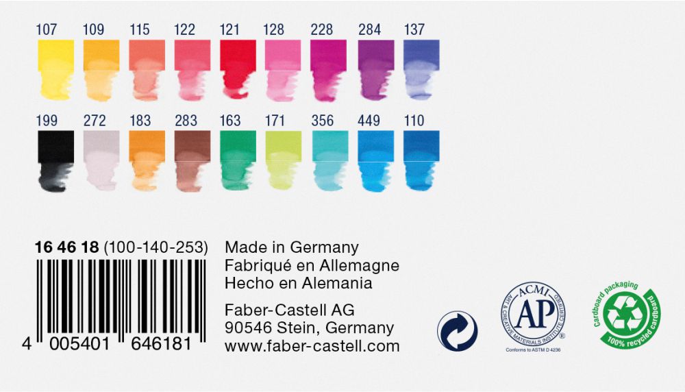 Goldfaber = meno, ktoré zaručuje kvalitu. Akvarelové popisovače sú súčasťou radu Creative Studio. Sú vyrobené v Nemecku a celosvetovo známa značka Faber-Castell je záruka vysokej kvality a odbornosti. Aqua Dual sú všestranné popisovače kombinujúce dva produkty v jednom. Pri práci sa ľahko otáčajú tam a späť, sú okrúhe, bez úchopovej zóny. Popisovač je idálny na písanie, skicovanie, kreslenie či maľovanie. Žiarivé farby sú riediteľné vodou.