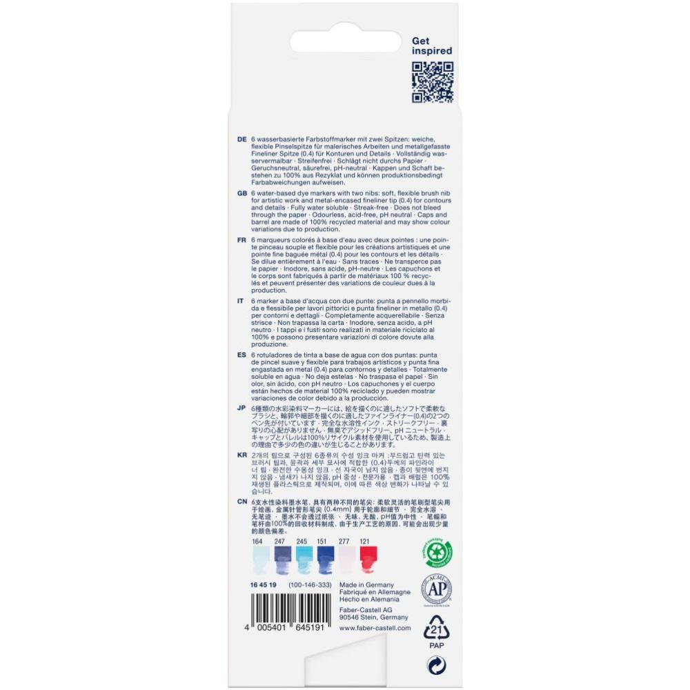 Goldfaber = meno, ktoré zaručuje kvalitu. Akvarelové popisovače sú súčasťou radu Creative Studio. Sú vyrobené v Nemecku a celosvetovo známa značka Faber-Castell je záruka vysokej kvality a odbornosti. Aqua Dual sú všestranné popisovače kombinujúce dva produkty v jednom. Pri práci sa ľahko otáčajú tam a späť, sú okrúhe, bez úchopovej zóny. Popisovač je idálny na písanie, skicovanie, kreslenie či maľovanie. Žiarivé farby sú riediteľné vodou.