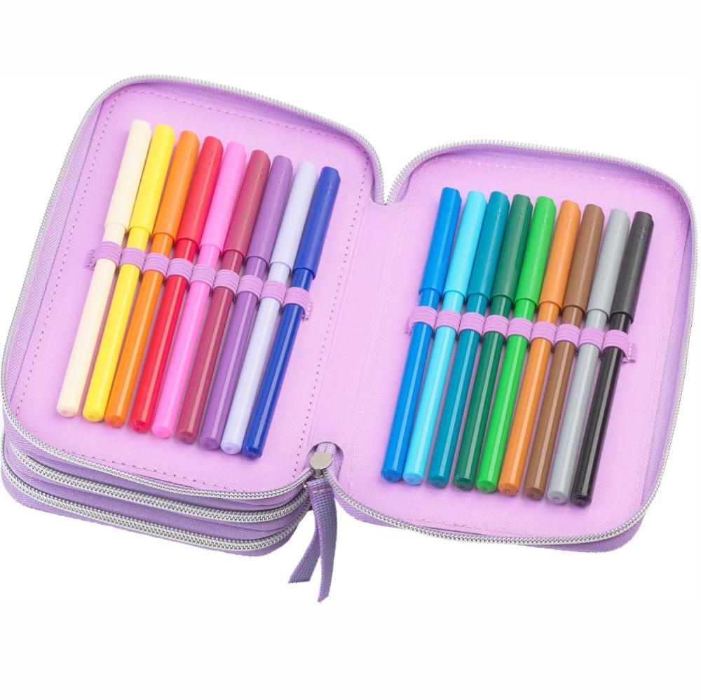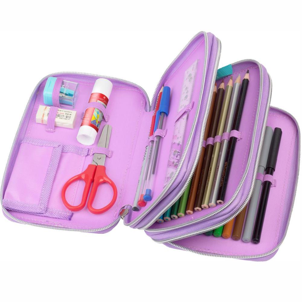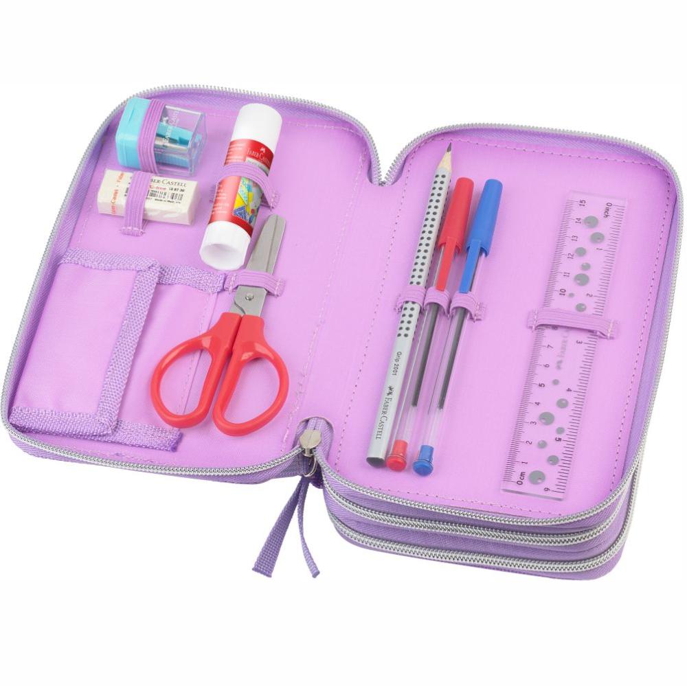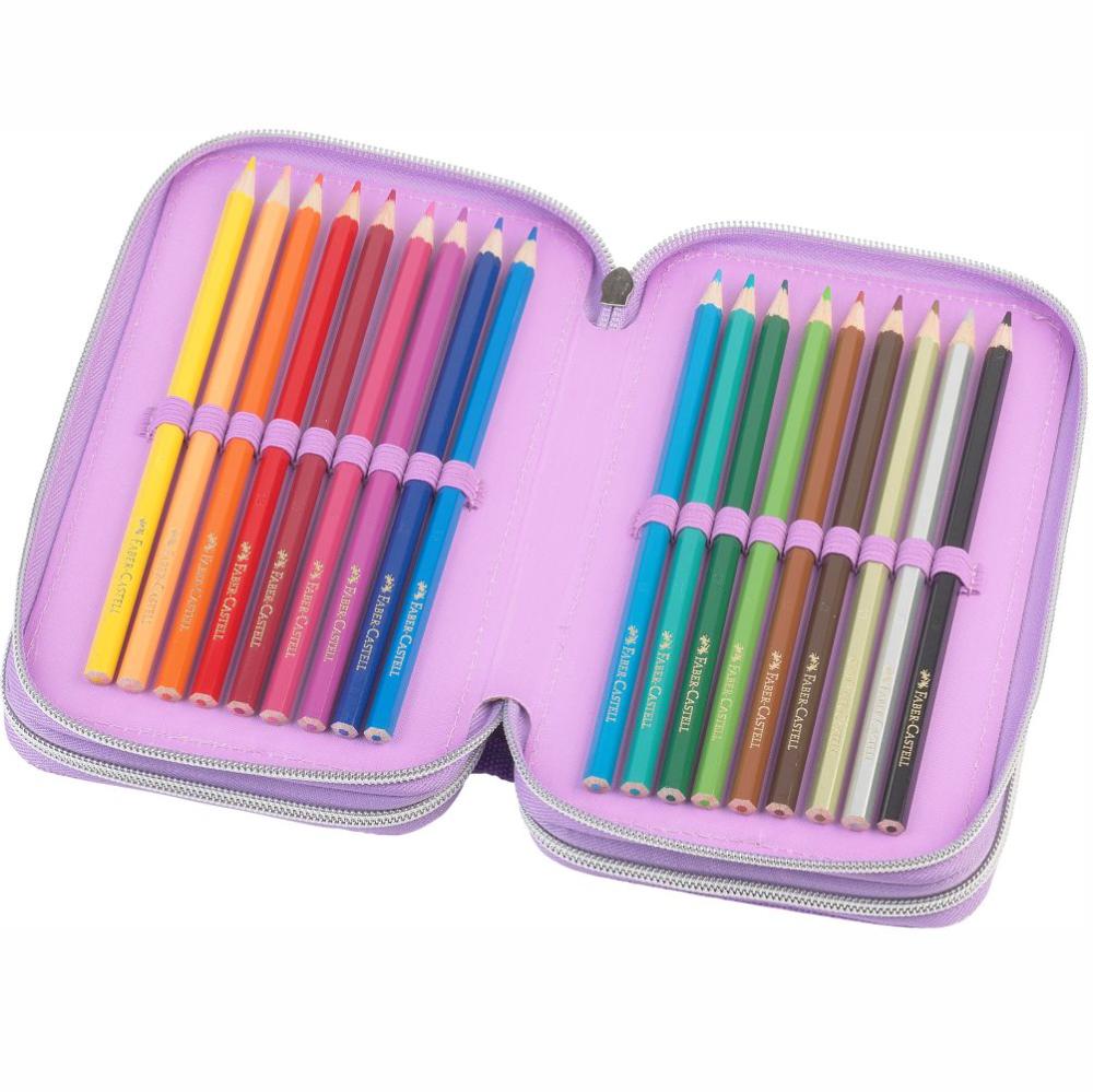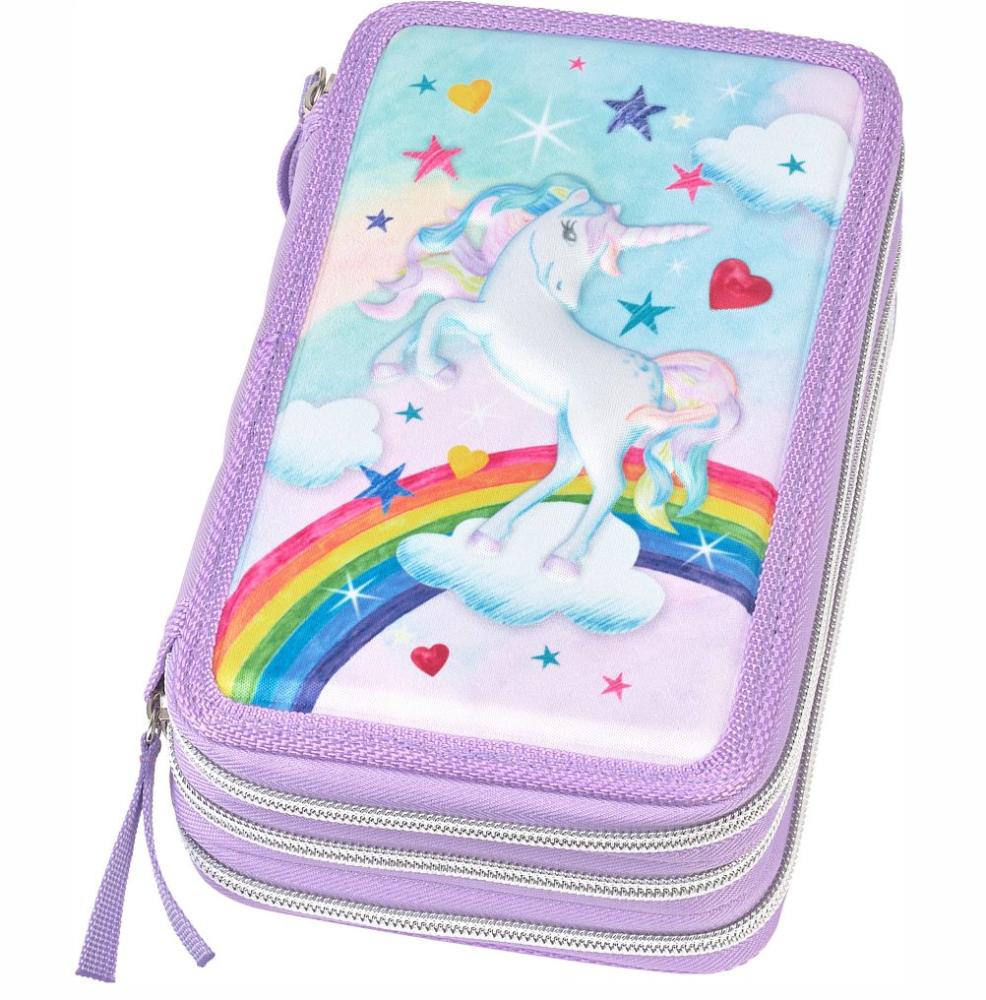 Školský peračník s trendy dizajnom Unicorn pre I. stupeň ZŠ, trojkomorový. Obsahuje všetky nevyhnutné písacie potreby značky Faber-Castell. Peračník má 3 priehradky uzatvárané na zips a vrecko na peniaze. Náplň: 18 ks farebných ceruziek, 18 ks fixiek, 1 ks grafitová ceruzka Grip, 2 ks guľôčkové pero (červené a modré), 1 ks nožnice, 1 ks lepiaca tyčinka 9 gr., 1 ks strúhadlo so zásobníkom, 1 ks guma bez PVC, 1 ks pravítko 15 cm