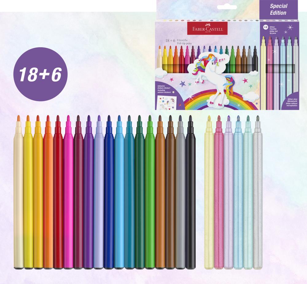 Sada guľatých fixiek pre každú príležitosť. Vhodné na maľovanie väčších plôch aj pre kreslenie jemných línií a detailov. Pevný hrot. Vyprateľné z väčšiny textílií. Obsahuje 18 klasických farieb + 6 glitrových farieb.
