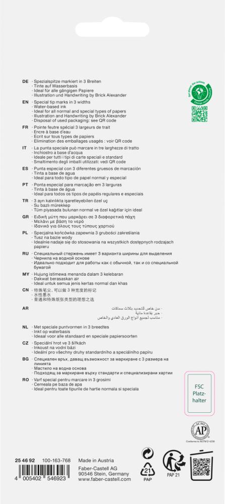 Nový dizjan a osvedčená kvalita pre zvýrazňovač, ktorý je vhodný pre všetky druhy papiera a zaručuje vysokú kvalitu zvýraznenia v troch hrúbkach: 1mm, 2 mm a 5 mm – podľa toho, v akom uhle sa trváca, plstená špička priloží k papieru. Univerzálny atrament je vyrobený na vodnej báze a zaručuje dlhodobú a vysokú výraznosť farieb. Vhodný do kancelárie, pre študentov aj domácnosť.