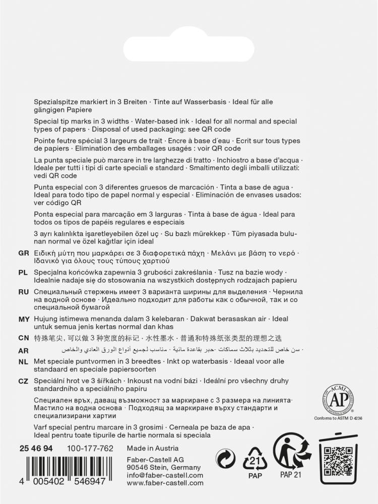 Zvýrazňovač Pastel vhodný pre všetky druhy papiera. Zvýrazňuje v troch hrúbkach: 1mm, 2 mm a 5 mm – podľa toho, v akom uhle sa plstená špička priloží k papieru. Jasný signál v prospech životného prostredia: univerzálny atrament je vyrobený na vodnej báze a zaručuje dlhodobú a vysokú výraznosť farieb. Vhodný do kancelárie, pre študentov aj domácnosť