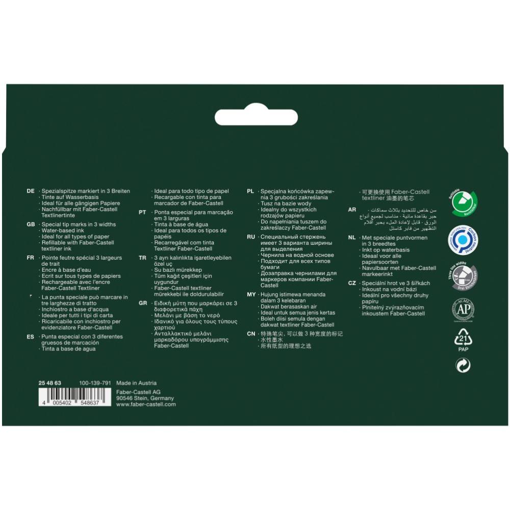 Zvýrazňovač 1548 je vhodný pre všetky druhy papiera a zaručuje vysokú kvalitu zvýraznenia v troch hrúbkach: 1mm, 2 mm a 5 mm – podľa toho, v akom uhle sa trváca, plstená špička priloží k papieru. Univerzálny atrament je vyrobený na vodnej báze a zaručuje dlhodobú a vysokú výraznosť farieb. Vhodný do kancelárie, pre študentov aj domácnosť. Možnosť opätovného naplnenia je samozrejmosťou.